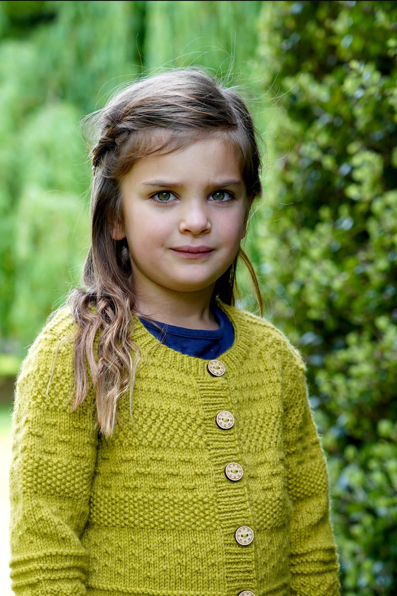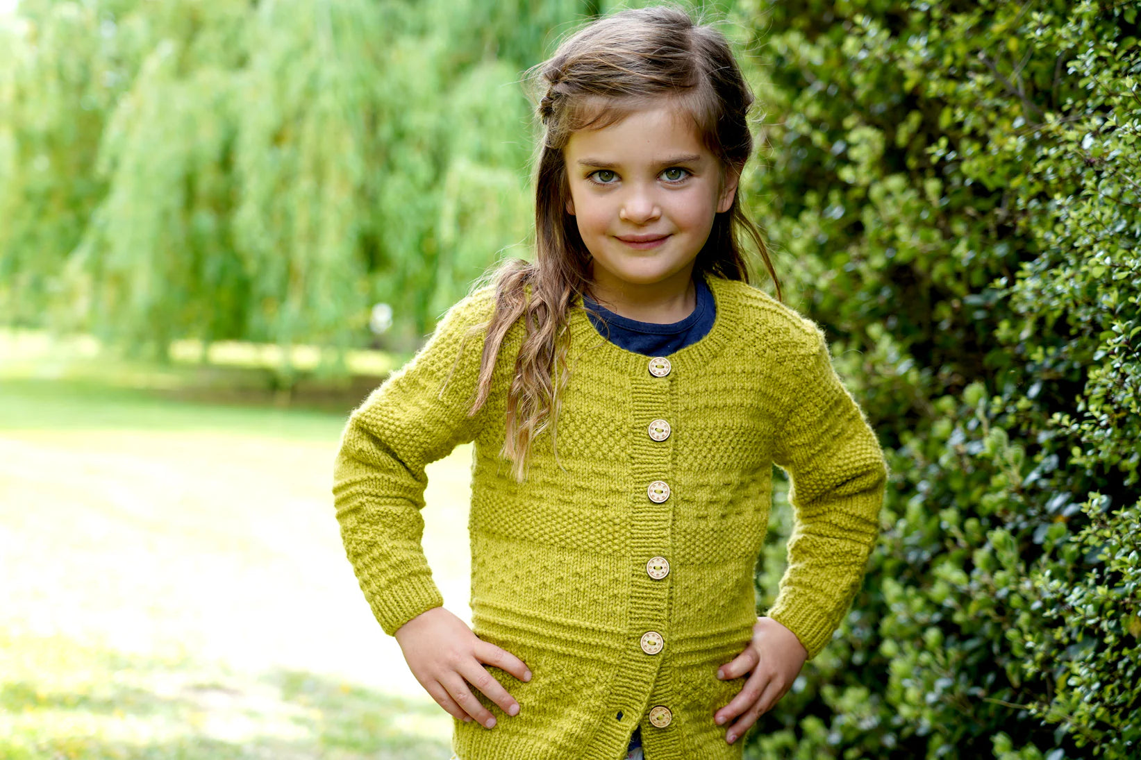 Signature lisaFdesign - Bold stripes of fun and easy knit and purl patterns. The textures are effective and beautiful in this crew neck cardigan… knit up in our Vespers 8ply merino for boys and girls and finished off with with our circle patterned bamboo buttons.