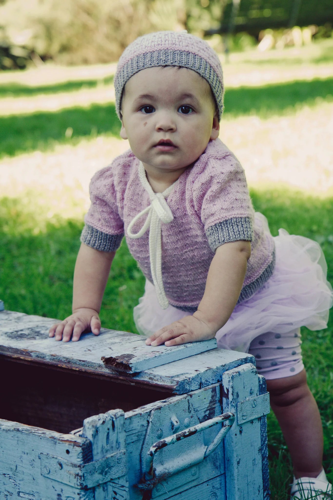 A seed stitch textured sweater with a front opening and a bow tie.