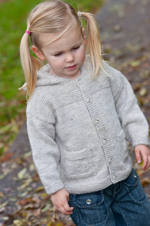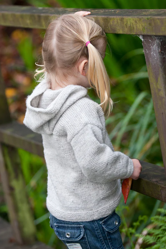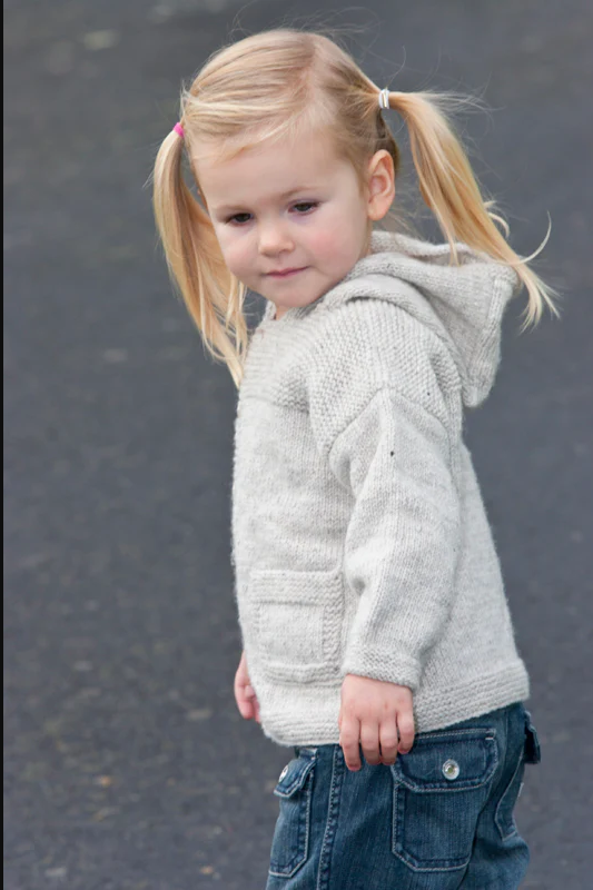 A simple knit textured hoodie with a garter stitch yoke and patch pockets for a boy or a girl.