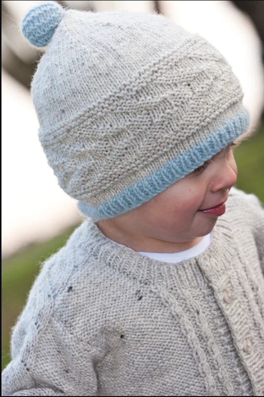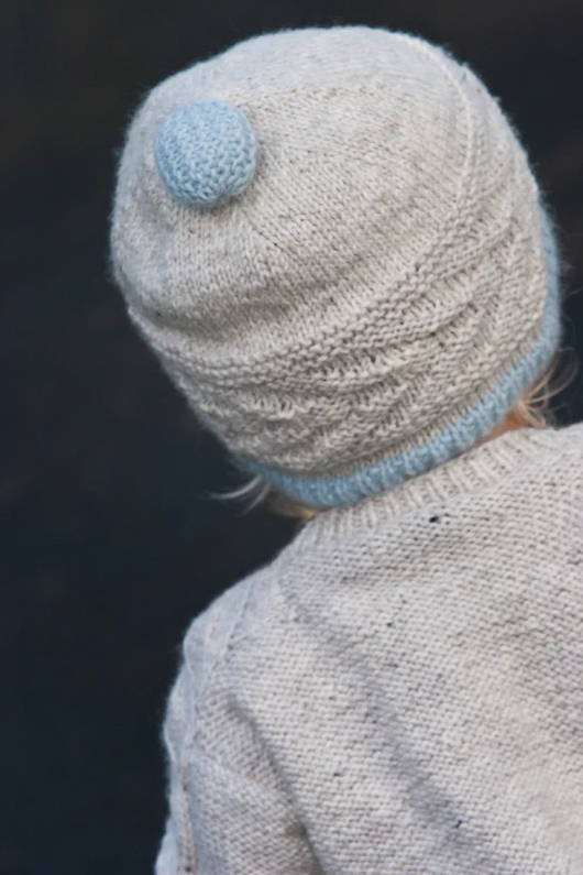 A textured hat for boys and girls with a garter stitch knitted pompom.