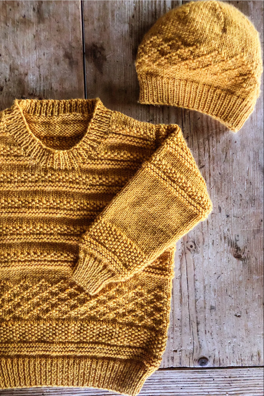 The Goldie Sweater and Hat is an adorable knit and purl textured sweater for your little Miss or Mr.