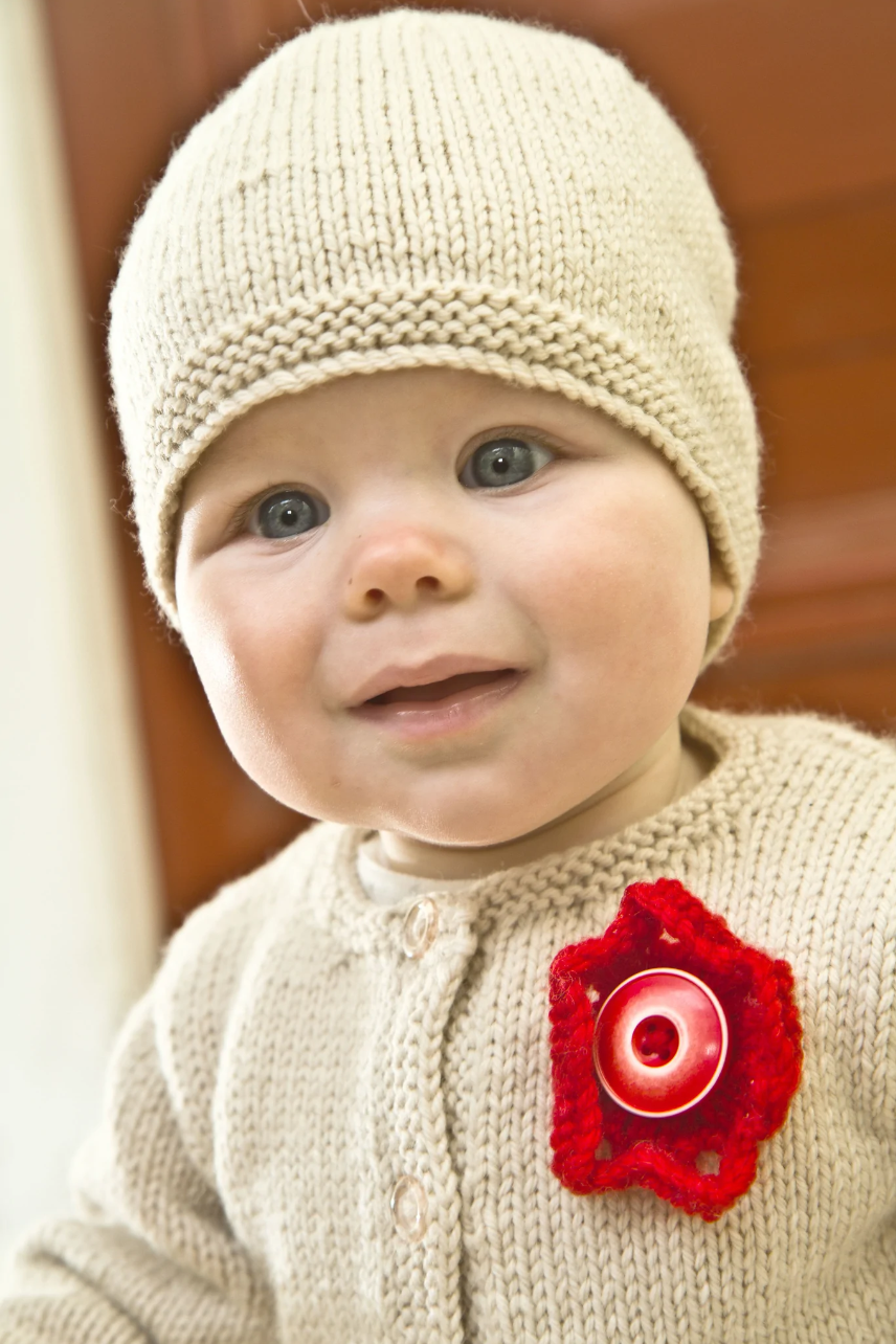 A crew neck cardigan with eyelet detail, a pretty knitted flower and a matching hat. Buttoned with garter stitch edging and semi set in sleeves.