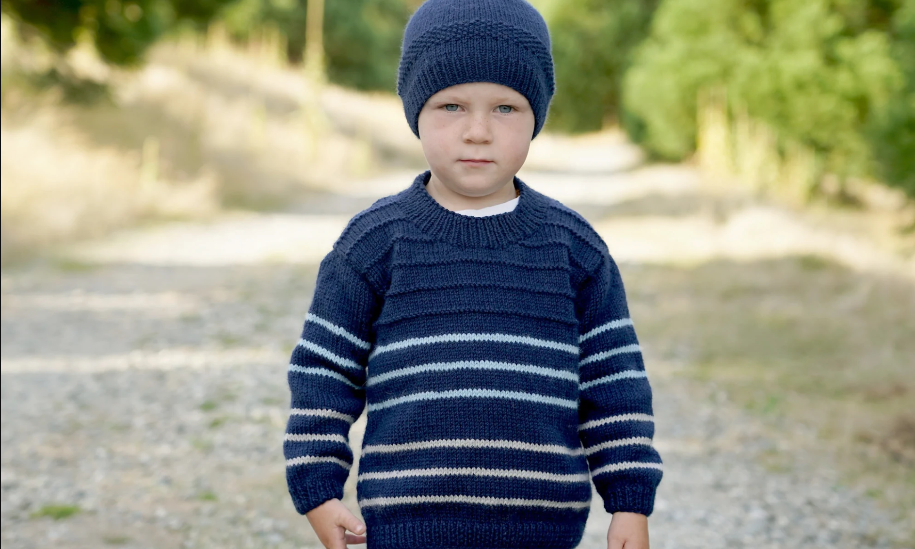 Stripes of colour and garter stripes make up this easy knit crew neck sweater.