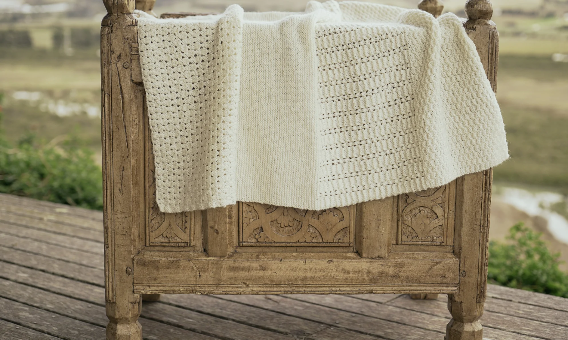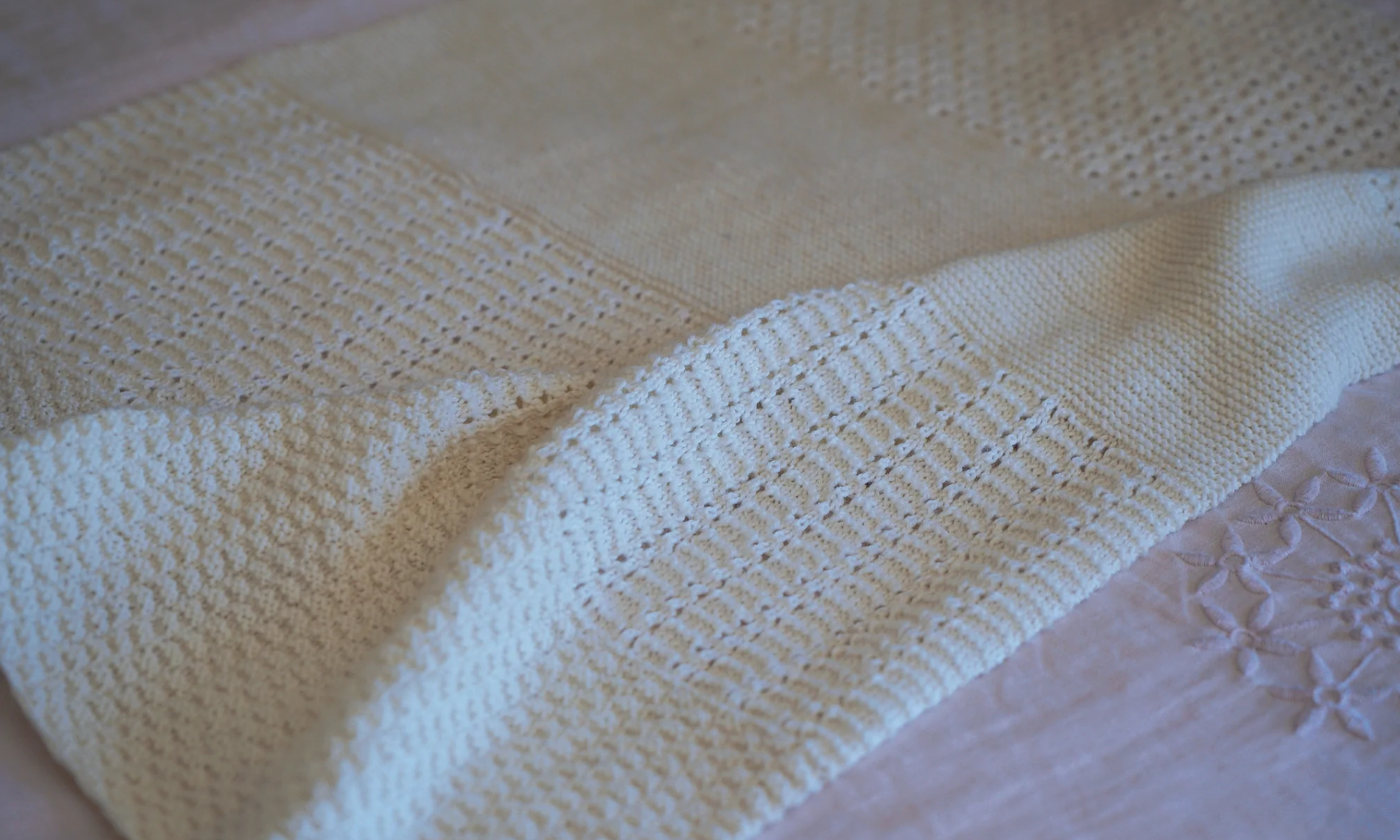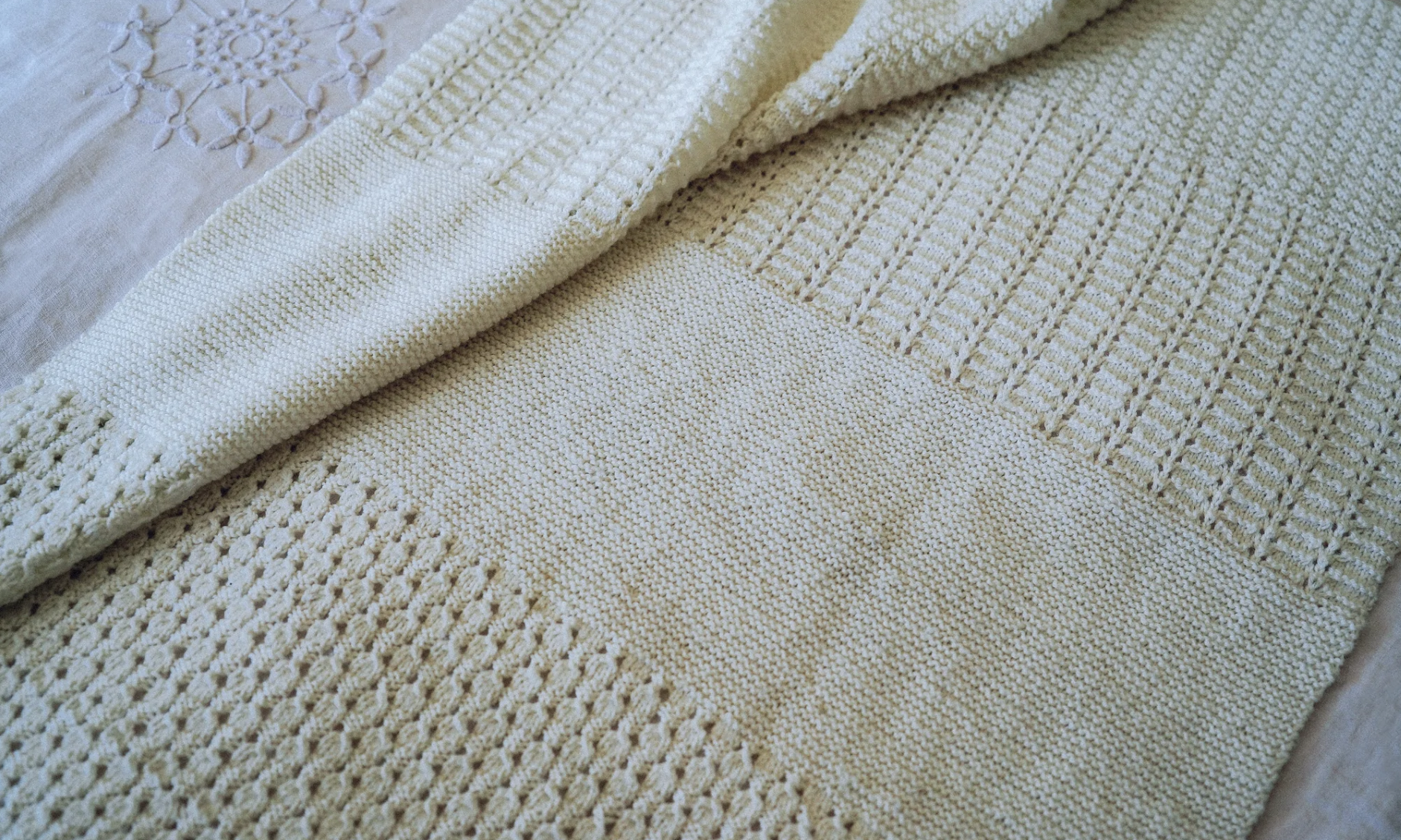 The four blocks consist of four different textures including garter stitch, lace patterns and double moss stitch.