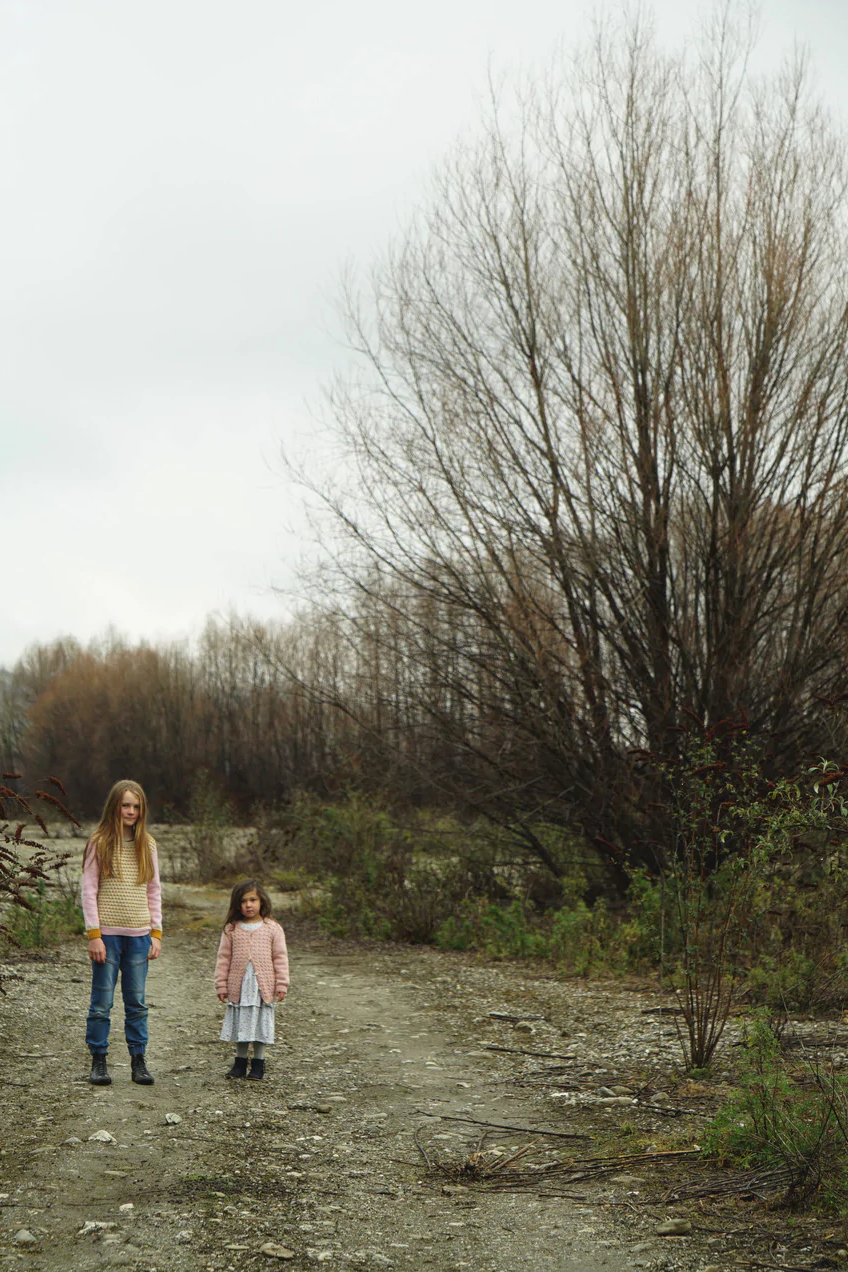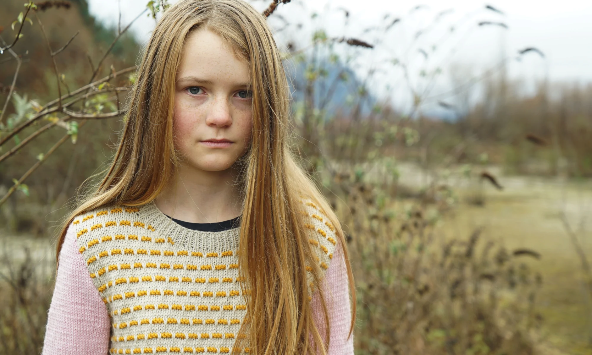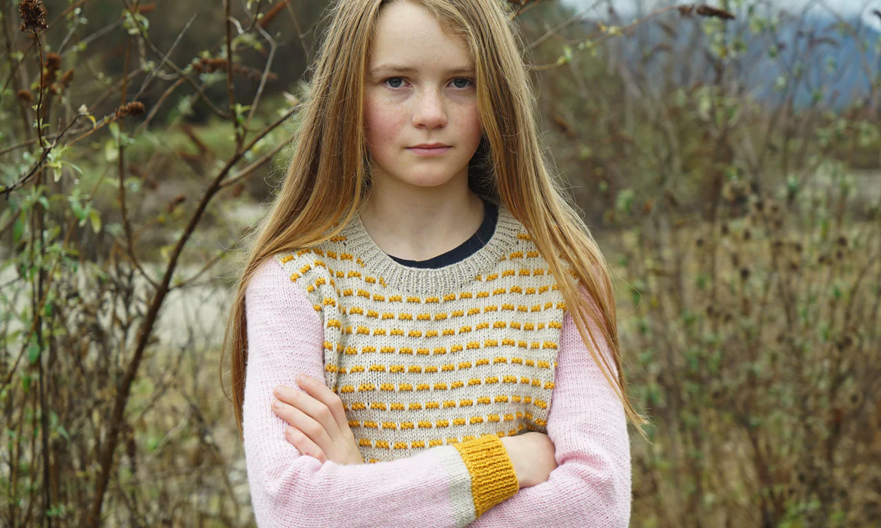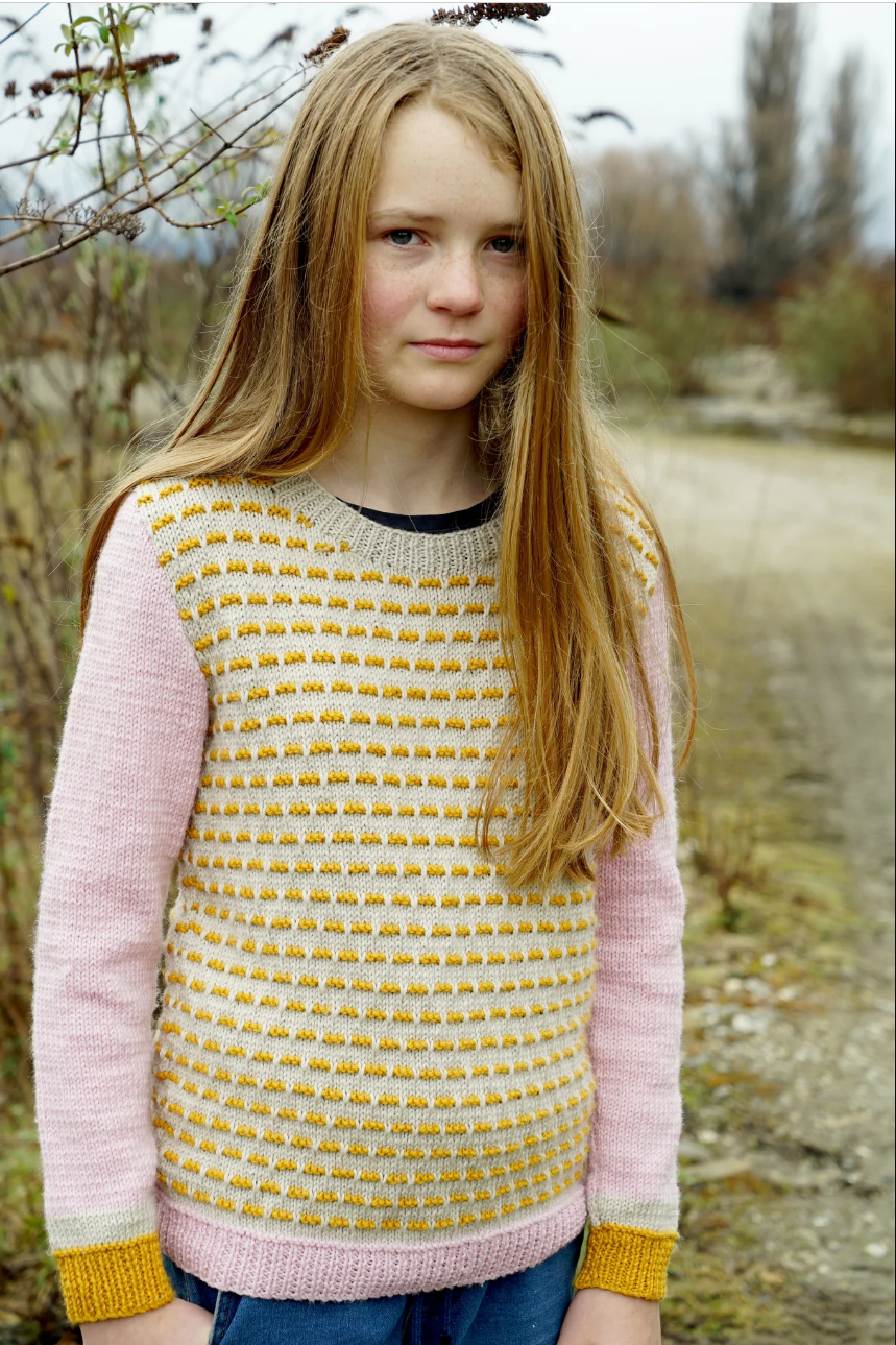 A three colour pattern with plain set in sleeves and garter stitch texture, knitted with slip stitches.