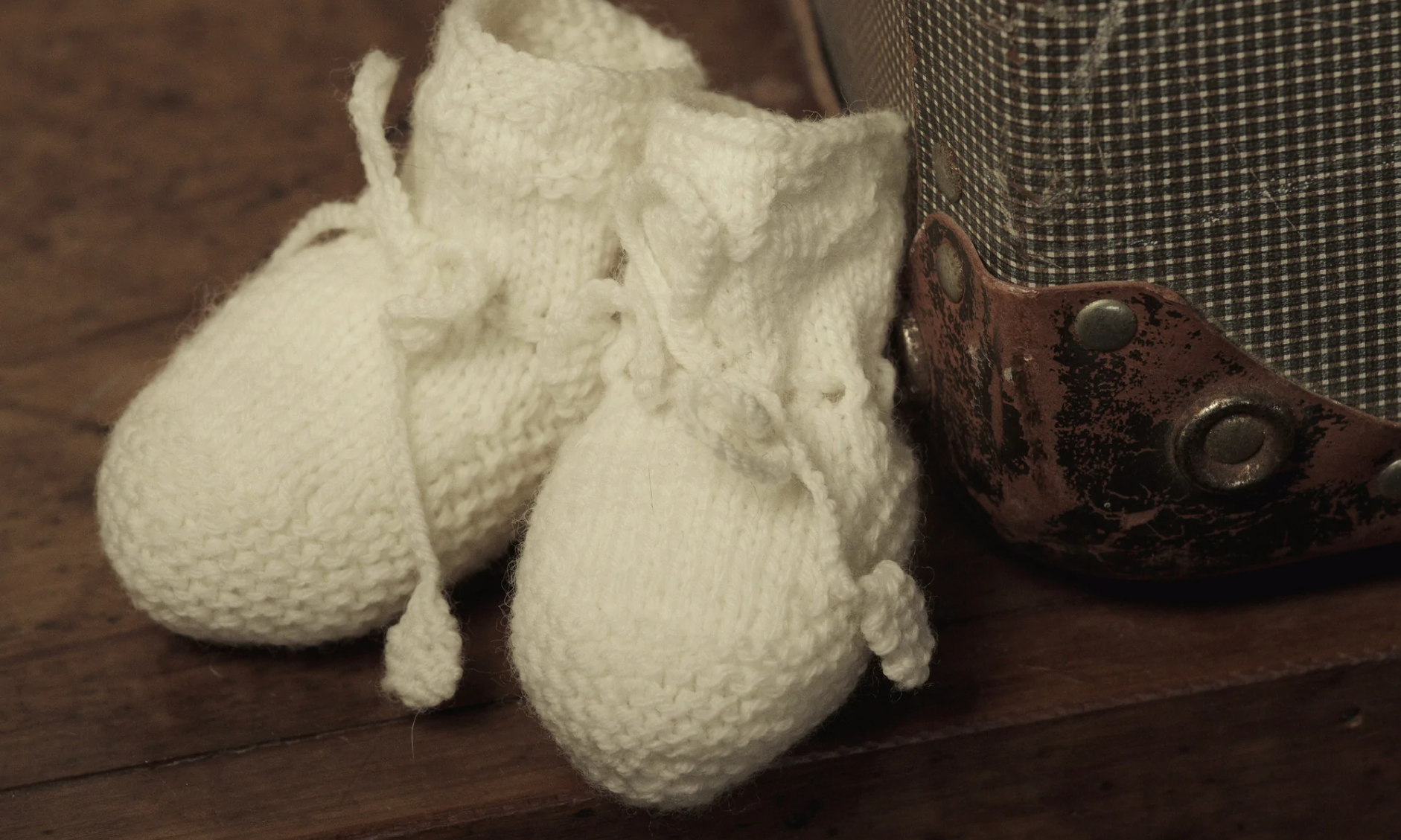 A matching Hat and Booties set, a knit and purl textured knit hat with a pompom to finish it off and booties to keep little toes warm.