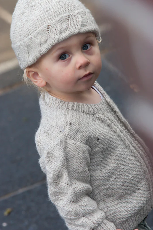 A mello little knitted cable jacket with saddle shoulders, crew neck and a coordinating hat.