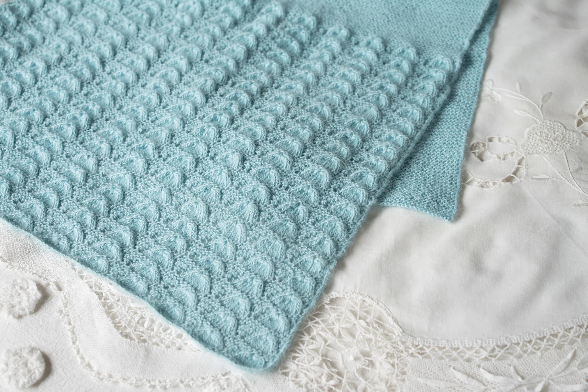 A block textured blanket of lace and garter stitch, a beautiful blanket pattern for a new baby.